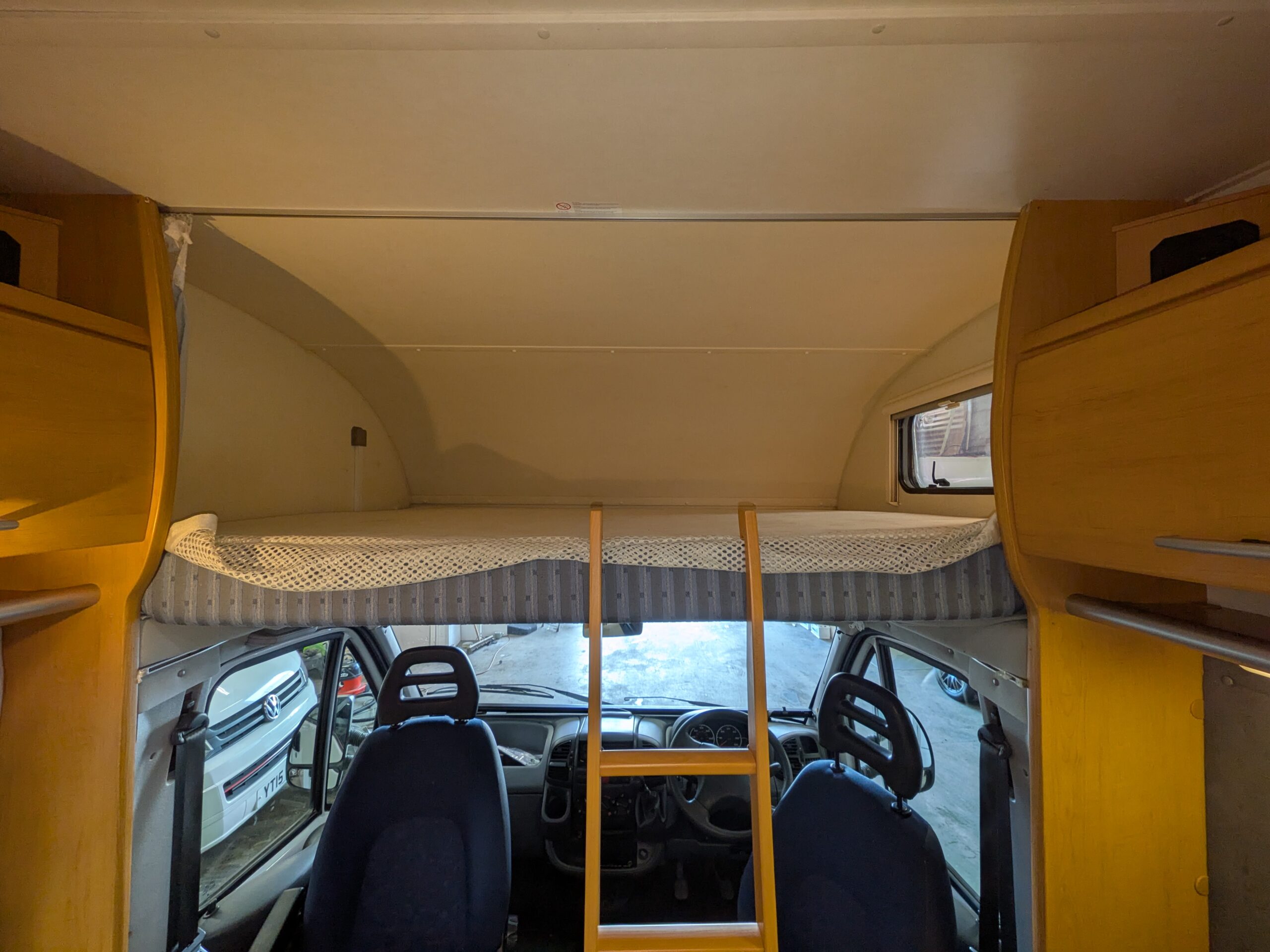 At the rear of the motorhome is a large fixed transverse bed with ample storage underneath