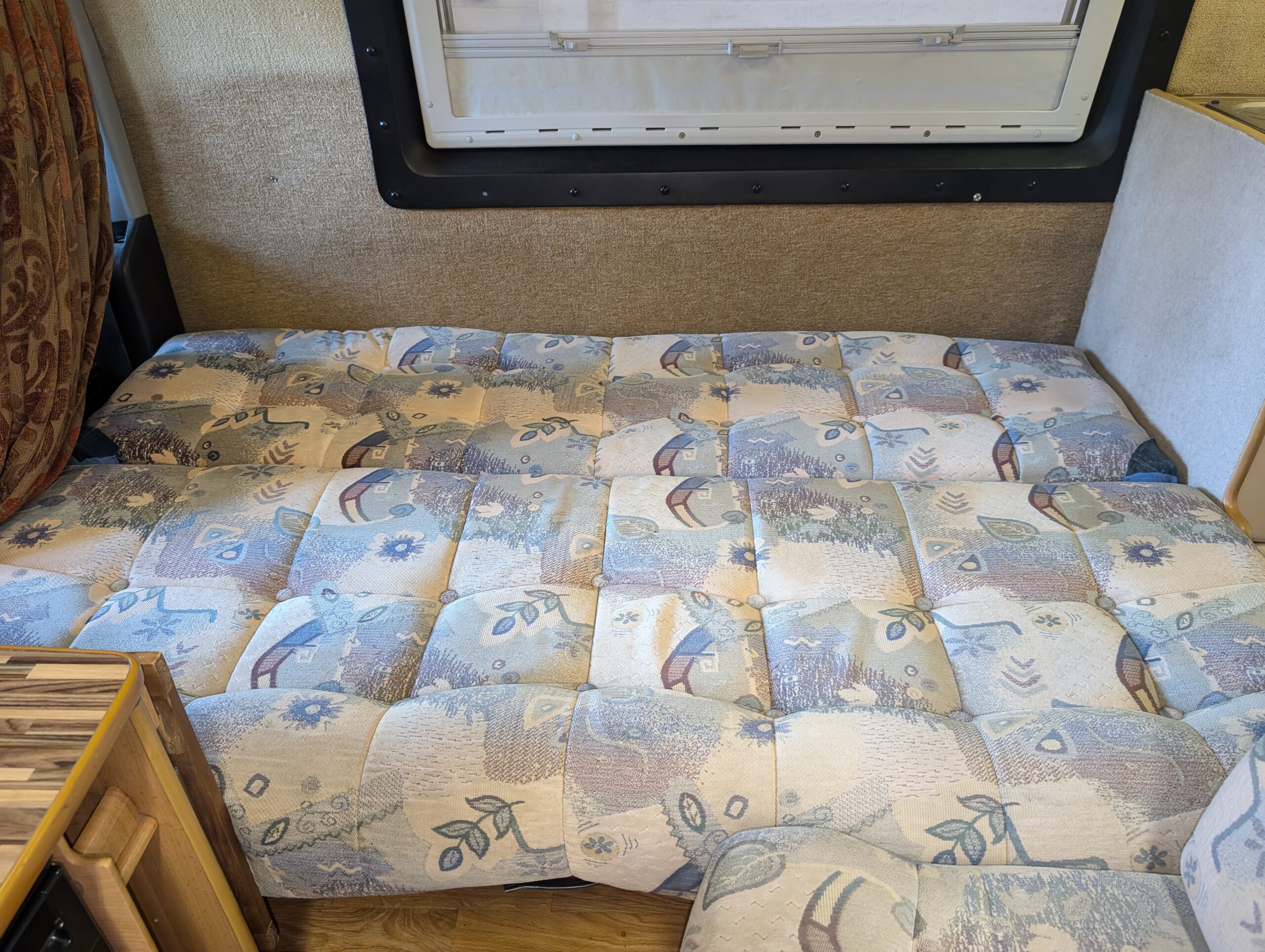 The forward lounge/dining area has a long side bench on one side and a buddy seat by the sliding door