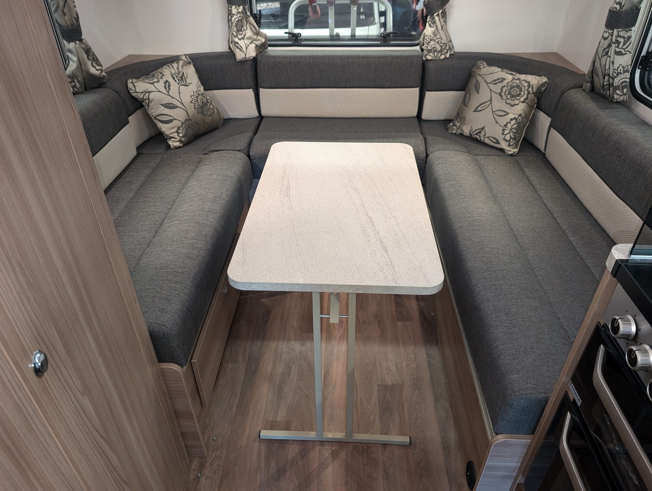 The rear of the motorhome has a large U shaped seating area